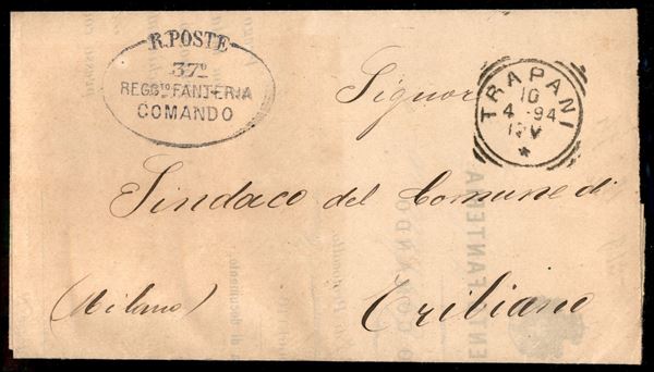 R.Poste/37° Regg.to Fanteria Comando - piego in franchigia di Trapani a Tribiano del 10.4.94