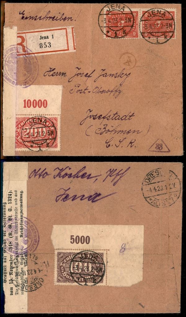 Raccomandata da Jena a Josefstadt (Boemia) del 3.4.23 con affrancatura multipla (206 coppia + 220 + 219 al retro) - censure