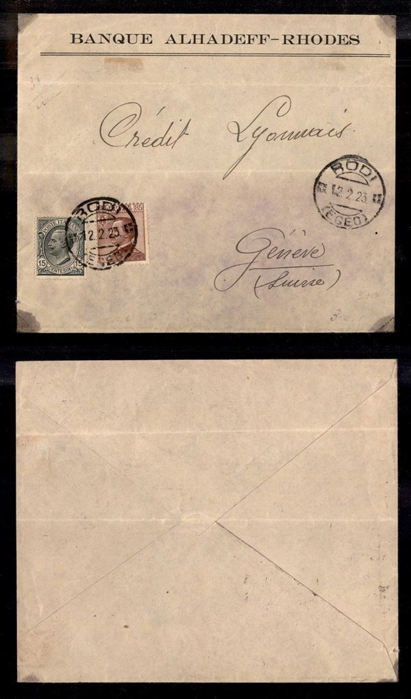 Rodi 12.2.23 - Busta per Ginevra del 12.2.23 con affrancatura di Regno (108 + 112)