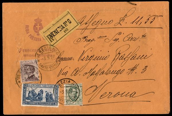 S. Francesco - 1,25 lire (196) + complementari (200 + 204) su raccomandata da Venezia a Verona del 3.5.27