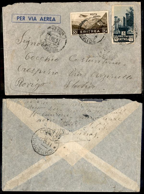 Sciaṇ (P.ti 10) - aerogramma per Rovigo del 10.10.37 (209 + 18 Aerea)