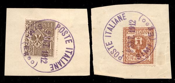 Simi 9 set. 1912 (viola) - 2 valori di Regno (68 + 69) usati su frammenti