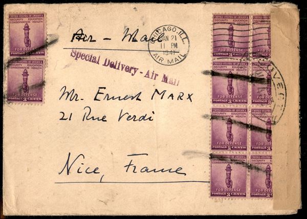 Special Delivery/Air Mail - busta da Chicago a Nizza del 21.1.1941