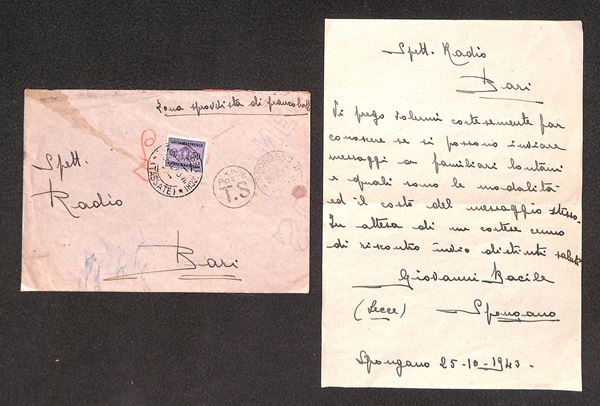 Spett. Radio Bari - Spongano 26.10.43 - busta tassata - richiesta di informazioni per invio di messaggi a familiari lontani - non comune