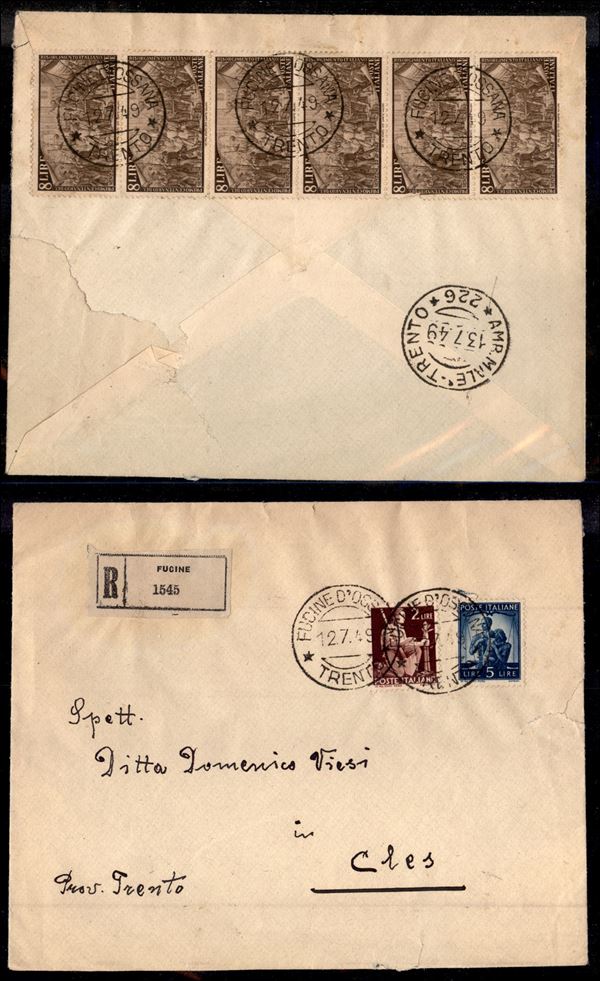 Striscia di sei del 8 lire Risorgimento (584) al retro di raccomandata con Democratica (552 + 555 al recto) da Fucine/Trento a Cles del 12.7.49 - un pezzo difettoso nella dentellatura