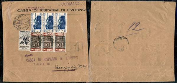 Striscia di tre del 60 lire ICAO (697) + 25 cent Alpini (698) + striscia di tre del 25 cent Parma (689) - raccomandata da Livorno a Campiglia del 6.10.52