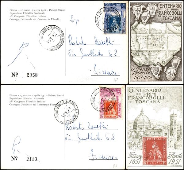 Toscana - 20 lire (653) + 55 lire (654) - due cartoline ufficiali FDC per la cittą - firenze 27.3.51 (165+)