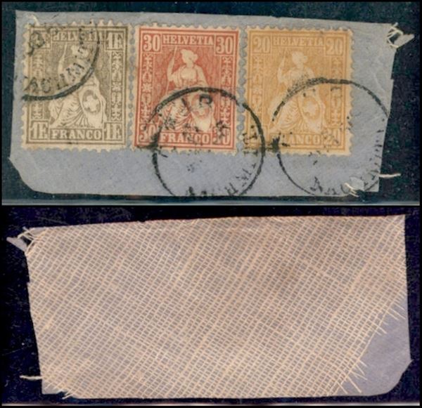 Tricolore - 20 cent (24) + 30 cent (25) + 1 franco (28) usati su frammento