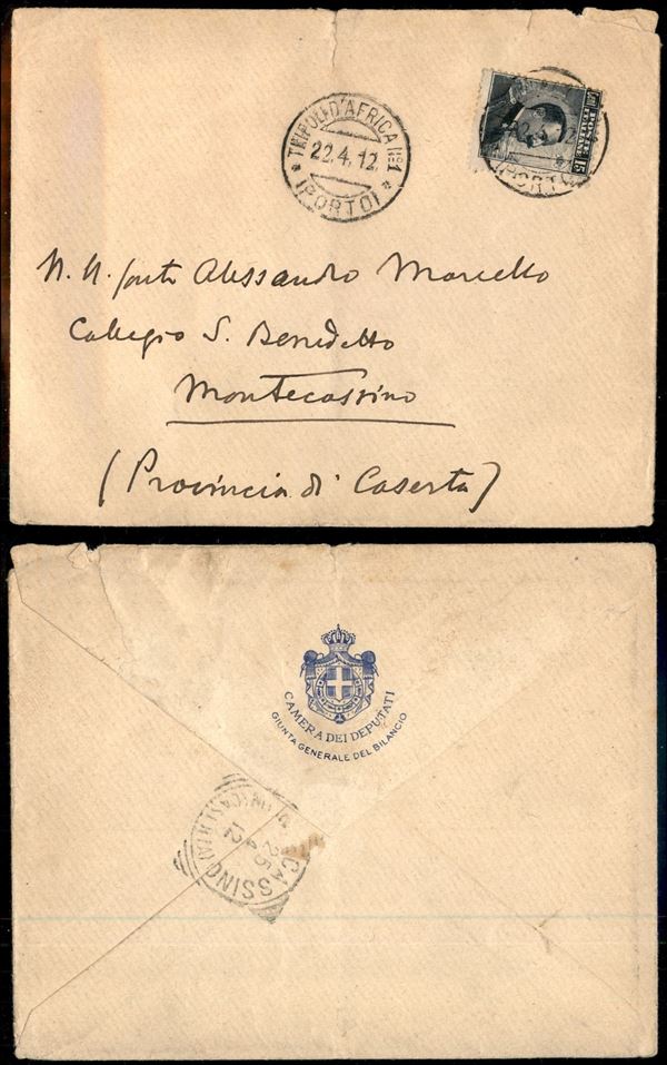 Tripoli d'Africa (Porto) 22.4.12 (P.ti 6) - 15 cent (96 Regno) su busta per Montecassino