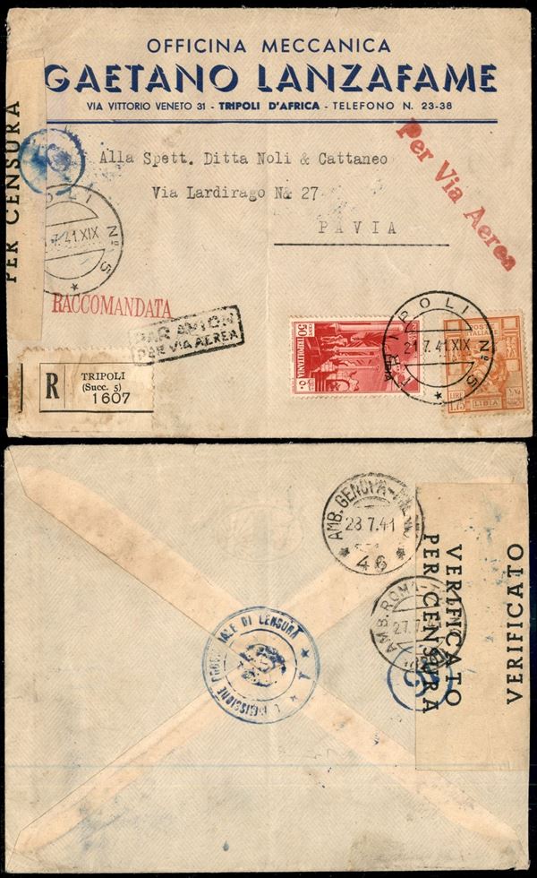 Tripoli N. 5 (P.ti 10) - aereogramma raccomandato da Tripoli a Pavia del 21.7.41