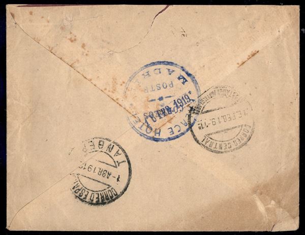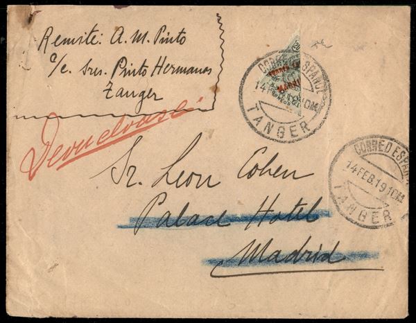 Ufficio Spagnolo - 20 cent (31) frazionato diagonalmente (metà sinistra) su busta da Tangeri a Madrid del 14.2.19 - Chiavarello