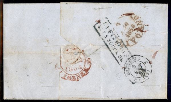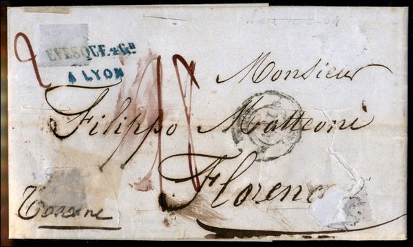 Uffizio di Sanità alla Bocca del Porto - lettera da Lione a Firenze del 4.8.54 via Livorno con tagli di disinfezione - tassata - qualche strappo