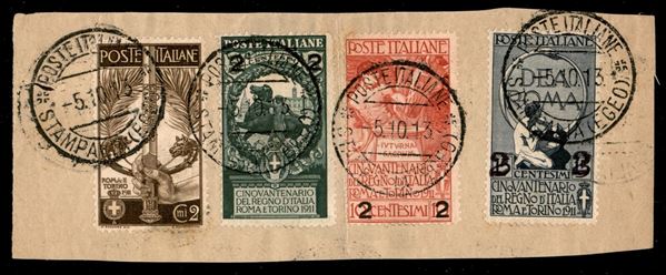 Unità d'Italia (Regno 92 + 99/101) - 4 valori usati a Stampalia il 5.10.13 su frammento