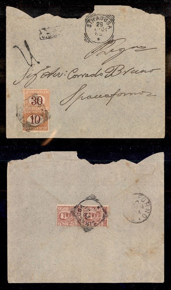 Uso misto Segnatasse (7+21) su lettera tassata per 40 cent affrancata con coppia 10 cent Floreale (38) da Siracusa 29.1.1904 per Spaccaforno
