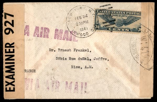 Via Air Mail - aerogramma da New York a Nizza del 24.2.1941