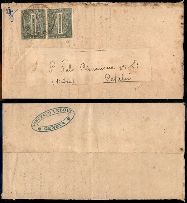 1 cent De La Rue (L14) - coppia orizzontale su parte di circolare da Genova a Cefalù del 4.2.65