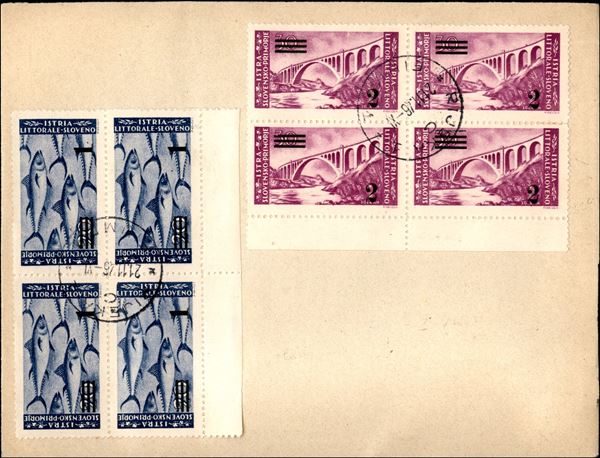 1 lira su 1,20 (61) + 2 lire su 30 (62) - due quartine bordo foglio usate su busta - notato (62c - 4 sbarre) - Rijeka 21.11.46