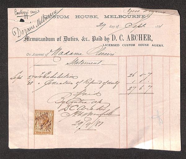 1 penny in uso fiscale su documento doganale - Melbourne 29.9.81