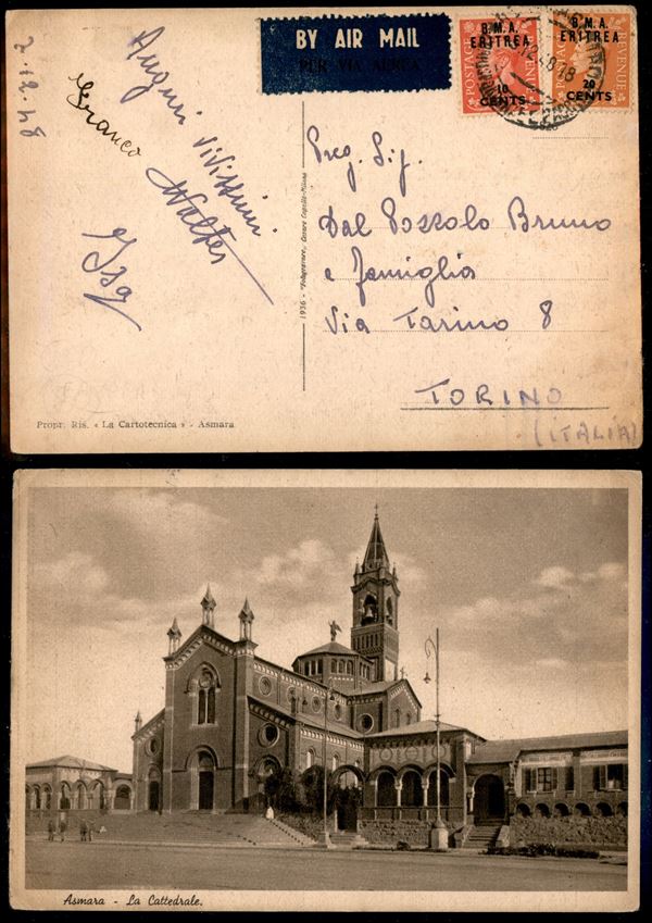 10 cent su 1 penny (2) + 20 cent su 2 pence (3) - cartolina da Asmara a Torino del 8.12.48 (200)