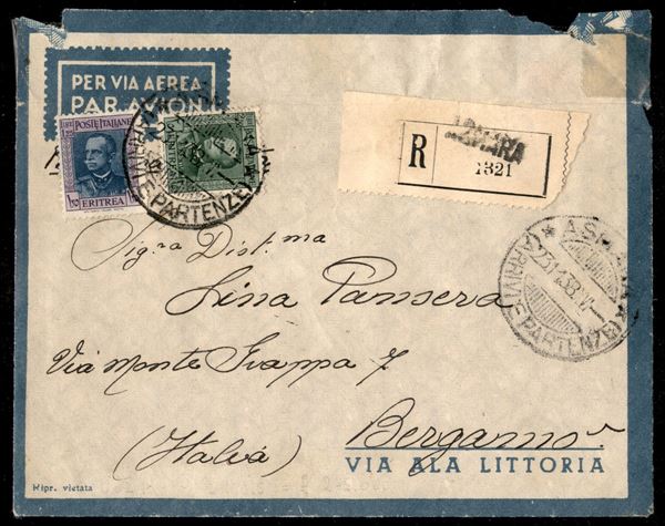 1,25 lire + 2,50 lire VE III (201 + 202) su aerogramma raccomandato da Asmara a Bergamo del 23.11.38