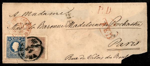 15 kreuzer (16) + 10 kreuzer (15) - bustina da Trento a Parigi del 17.5.60