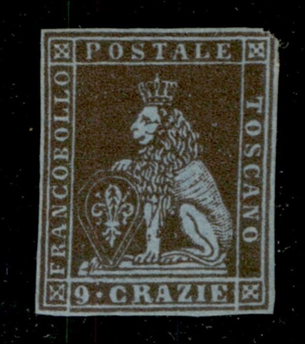 1851 - 9 crazie (8a - viola bruno scuro su azzurro) - nuovo senza gomma - angolo superiore destro difettoso - cert. AG (10.000)