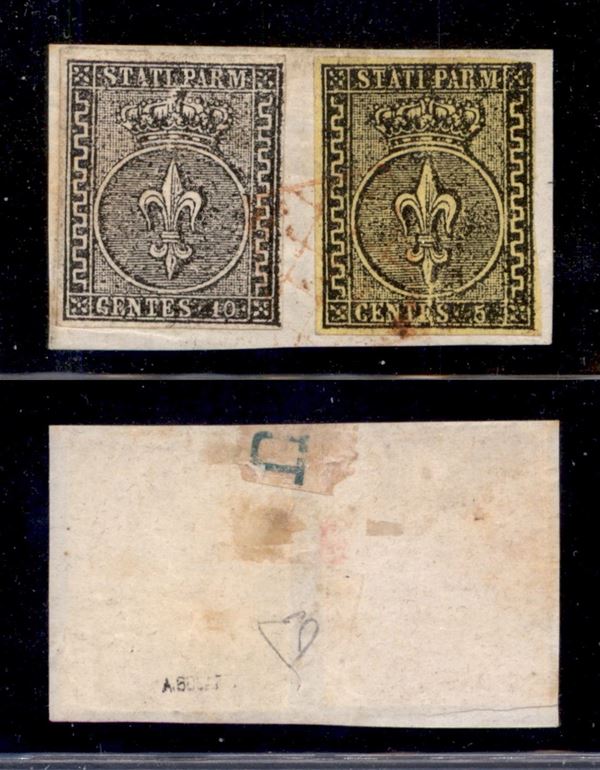 1852 - 10 cent (2) + 5 cent (1) su frammento annullato con griglietta in rosso - Diena