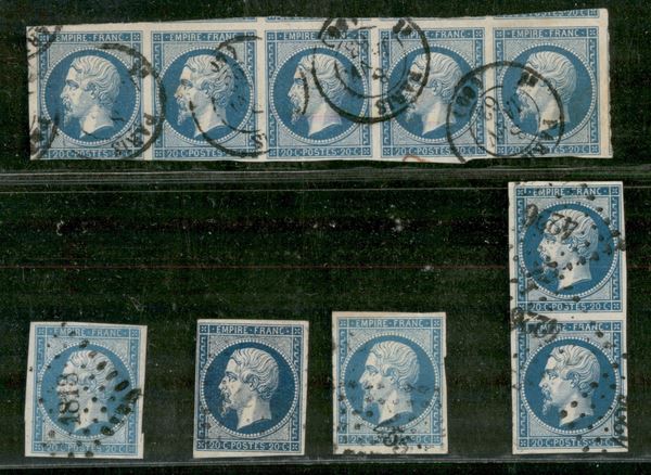 1853/60 - 20 cent Napoleone III (unif.14) - piccolo insieme di 10 pezzi di cui 3 singoli + 1 coppia verticale + striscia orizzontale di 5 - tonalità diverse - usati - da esaminare