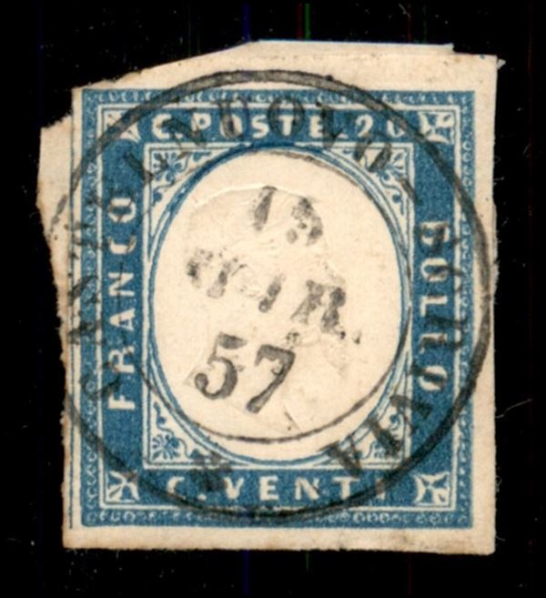 1855 - 20 cent (15h - celeste vivace) usato a Castelnuovo Scrivia su frammento