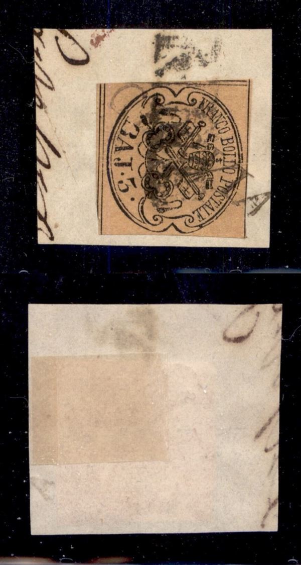1858 - 3 bai (4s/t - giallo paglia) usato a Cervia (P.ti 9) su frammento - B rotta (pos. 12) - raro insieme