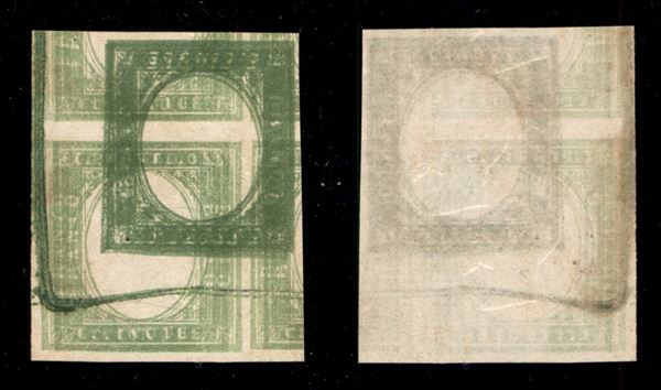 1863 - 5 cent verde chiaro (13Eb) con parte di 3 vicini + 5 cent verde cupo (13Ea) - linee angolari di riquadro - tutti con effigie singola e doppia stampa del disegno - senza gomma