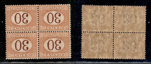 1890 - 30 cent (23a - Segnatasse) in quartina con cifre capovolte - gomma integra - ottimamente centrata (240/480)
