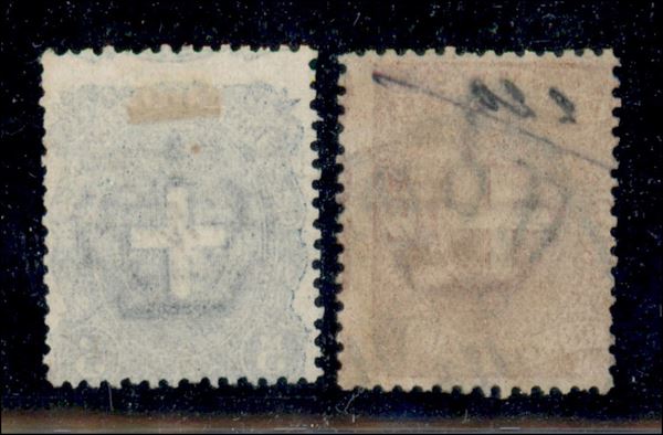 1896/1897 - 2 cent Stemma (66 varietà) con dentellatura verticale spostata a destra (e diciture marginali) + 5 cent Stemma (67 varietà d) con dentellatura orizzontale spostata in alto - entrambi usati - non catalogato