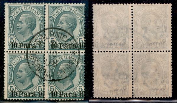 1907 - 10 para su 5 cent Leoni (10 cb varietà da) - soprastampe spostate in basso a destra - quartina usata
