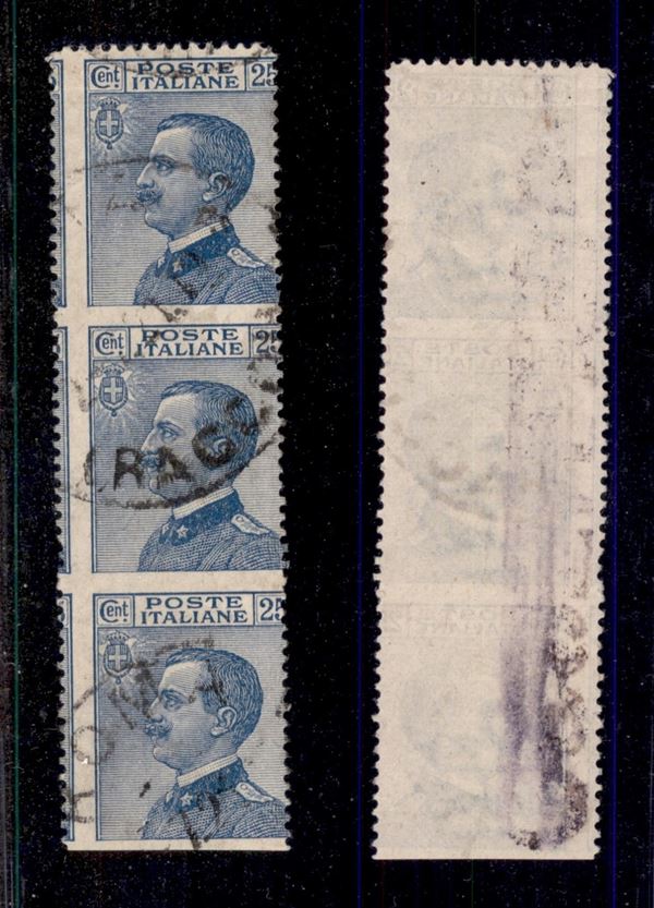 1908 - 25 cent Michetti (83g + 83f + 83f) striscia verticale usata - dentellata orizzontalmente solo in alto - non catalogata