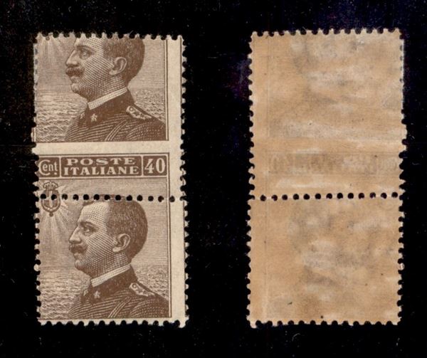 1908 - 40 cent Michetti (84me + md) - coppia verticale (vedi nota catalogo) con gomma originale (integra nel pezzo inferiore) - dentellature orizzontali (superiore e centrale) oblique (non catalogato) - cert. AG
