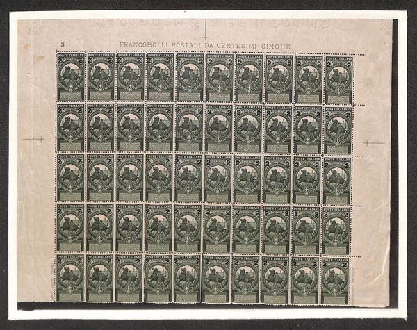 1913 - 2 cent su 5 (99/99b) - blocco di 50 (mezzo foglio superiore) con Numero di Tavola (3) - gomma integra