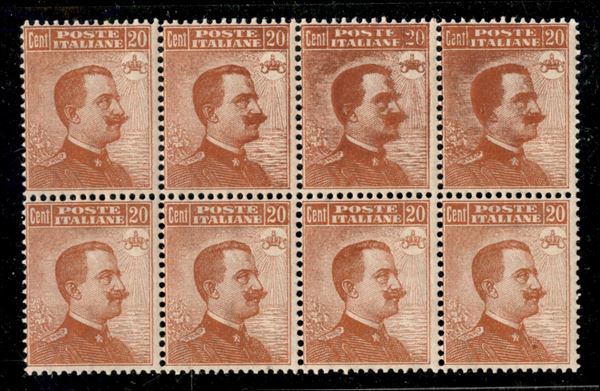 1917 - 20 cent Michetti (109) - blocco di otto - inchiostrazione da normale a impastata (su 3 pezzi) - gomma integra - non comune (200++)