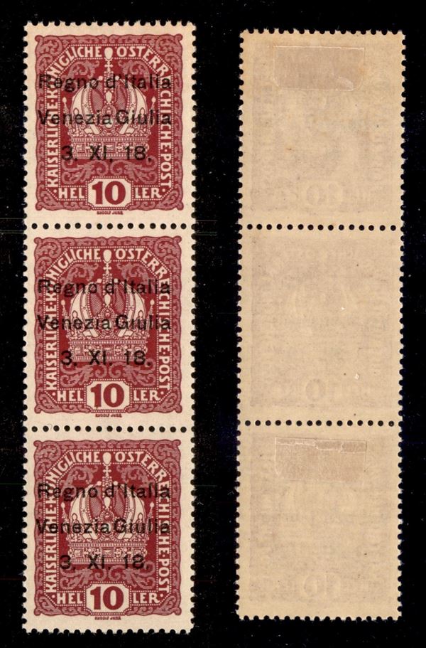 1918 - 10 heller (4) - striscia verticale di 3 con errori di composizione - virgola dopo XI (pos. 18) + i senza punto (4l - pos. 28) + Italla (4m - pos. 38) - gomma originale (integra sul pezzo centrale)