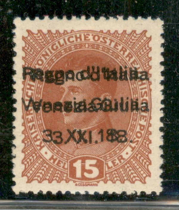 1918 - 15 heller Soprastampato (6c) - doppia soprastampa di cui una lievemente obliqua - gomma originale con traccia di linguella