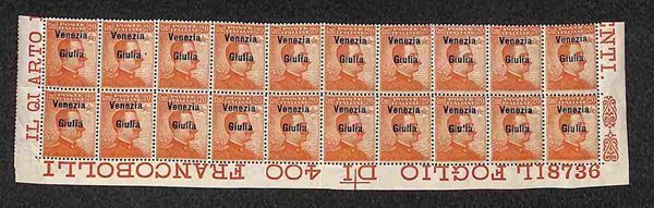 1918 - 20 cent (23 varietà) - blocco angolare di 20 con soprastampe spostate in alto + numero di Tavola 8736 - gomma integra