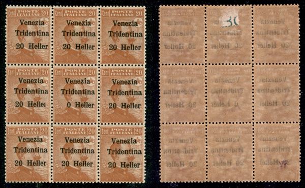 1918 - 20 heller su 20 cent (30) - blocco di 9 con errori 30d + 30c al centro - gomma integra (415+)
