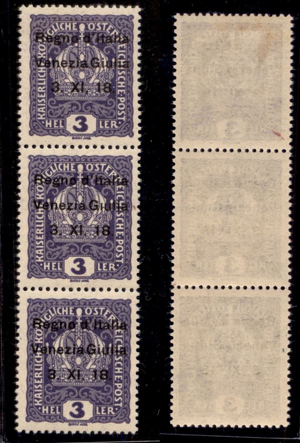 1918 - 3 heller (1 varietà + 1l + 1m) - striscia verticale di 3 con errori (virgola dopo XI + i senza punto + Italla) - gomma originale (pezzo centrale integro)