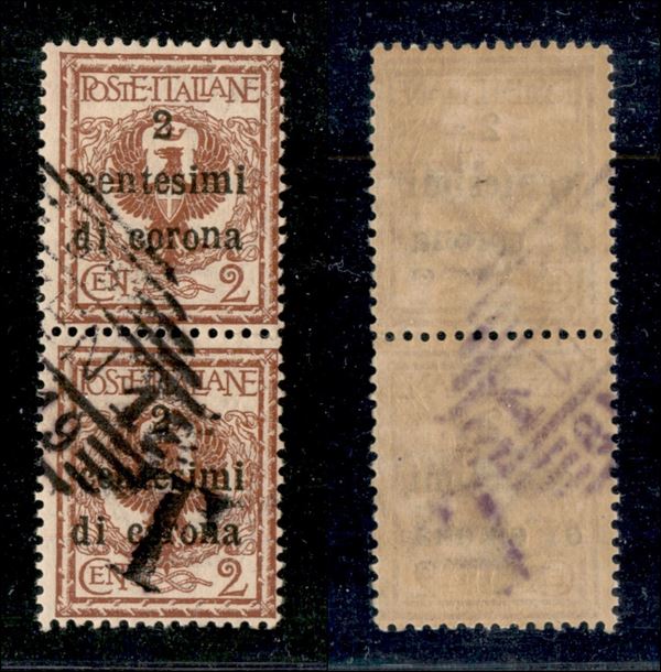1918 - T su 2 cent (11Af) - coppia verticale (senza soprastampa + T obliqua) usata (320)