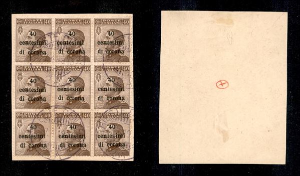 1919 - 40 cent su 40 cent (7+7l) - blocco di 9 su frammento - errore ccrona al centro (250+)