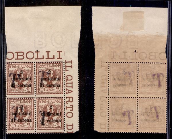 1919 - T su 2 cent su 2 (11Ac) - quartina angolare - soprastampe oblique - gomma originale (due gomma integra)