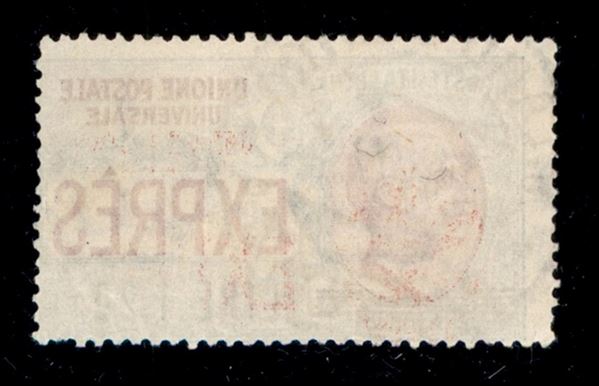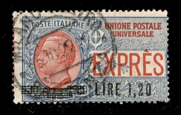 1921 - 1,20 lire su 30 cent (5 - Espressi) usato - dentellatura verticale spostata e parti di diciture marginali (in rosso) a sinistra - non catalogato