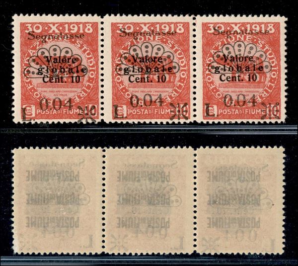 1921 - Segnatasse - 0.04 su 10 cent (26g) - striscia di 3 con soprastampe oblique - gomma integra