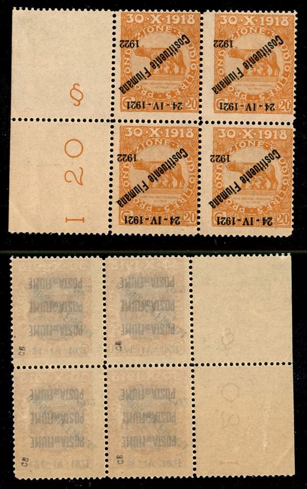 1922 - 25 cent Costituente (182b) - quartina bordo foglio con soprastampe capovolte - gomma integra