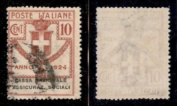 1924 - 10 cent Assicuraz. Sociali (25 - varietà) usato - dicitura spostata obliqua - non catalogato